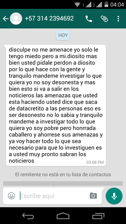 Pensé que el tema moriría ahí, pero esta persona siguió con sus amenazas, y hace como media hora desde que escribo esto, me envió este mensaje.