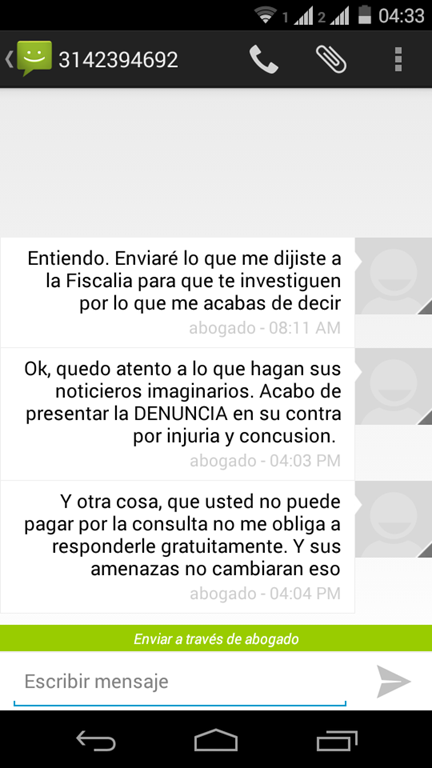 No sé qué se le habrá pasado por la cabeza a esta persona para querer constreñirme para que le respondiera de manera gratuita, o de dónde habrá sacado que yo soy “desonesto” (SIC). O peor, de dónde habrá sacado que “deshonesto”no lleva ache. Pero no sobra advertir que me tomo este tipo de amenazas e insultos muy en serio y procederé a responder en consecuencia. En este caso, he acudido a la Fiscalía a fin de que investiguen los posibles delitos que haya cometido esta persona.
