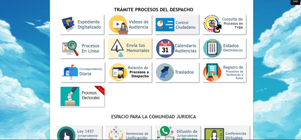 Cuando entramos a la página, vemos como esta tiene unos bonitos íconos que son muy amigables para el usuario. En ellos se puede encontrar desde una presentación de quienes actualmente trabajan en el despacho (incluyendo a la Magistrada que actualmente lo preside, la doctora Maria Victoria Quiñones Triana. A continuación, en la misma sección podemos encontrar las audiencias virtuales, incluso algunas audiencias realizadas por medios electrónicos. Estas audiencias electrónicas van a servir para saber cómo se manejan las audiencias en esta jurisdicción.