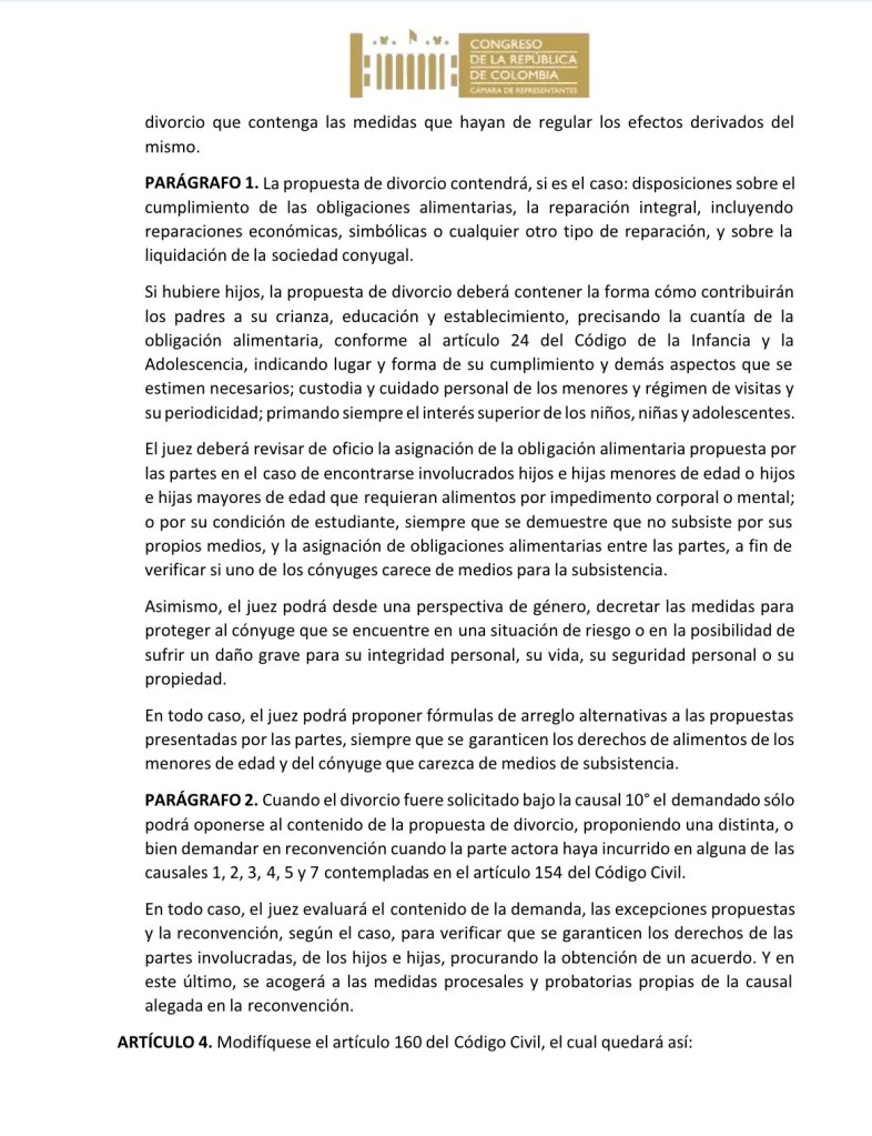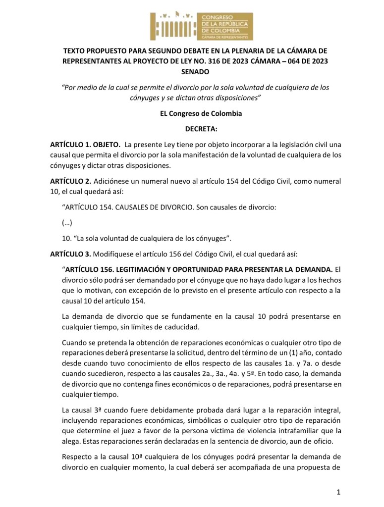 A sanción presidencial pasó el proyecto de ley 316 DE 2023 CÁMARA – 064 DE 2023 SENADO, que fue aprobado por la Cámara de Representantes el pasado 26 de noviembre de 2024. El 27 de diciembre esta ley fue sancionada, y ahora es la LEY 2442 DE 2024. Este proyecto de ley es importante, porque crea una causal décima de divorcio, consistente en que se puede invocar por la sola voluntad de cualquiera de los cónyuges. Además, trae modificaciones fundamentales, de las que luego hablaremos.