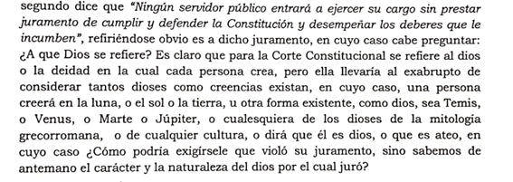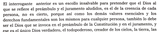 En este punto, aprovecho para recordarle a don Ramiro, el Juez que preside ese despacho, que en este mundo absolutamente todos somos ateos, con la única diferencia de que un ateo declarado cree en un dios menos que usted. Cuando se ponga a pensar por qué usted sólo cree en un dios y no en los miles de dioses habidos y por haber que existen, y han existido, a lo largo de la historia de la humanidad, verá el porqué un ateo no creen en el suyo. Además, podrá responder a la pregunta que se hizo en el fragmento del fallo citado.