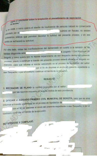 Señoras y señores: Este Juzgado admitió una demanda ejecutiva POSTERIOR a la aceptación del trámite de negociación de deudas del demandado (esto, por cierto, le puede costar la tarjeta al abogado que la inició). Eso en sí mismo no es algo grave. Lo grave viene cuando NIEGA LA NULIDAD de ese proceso con esta perlita: